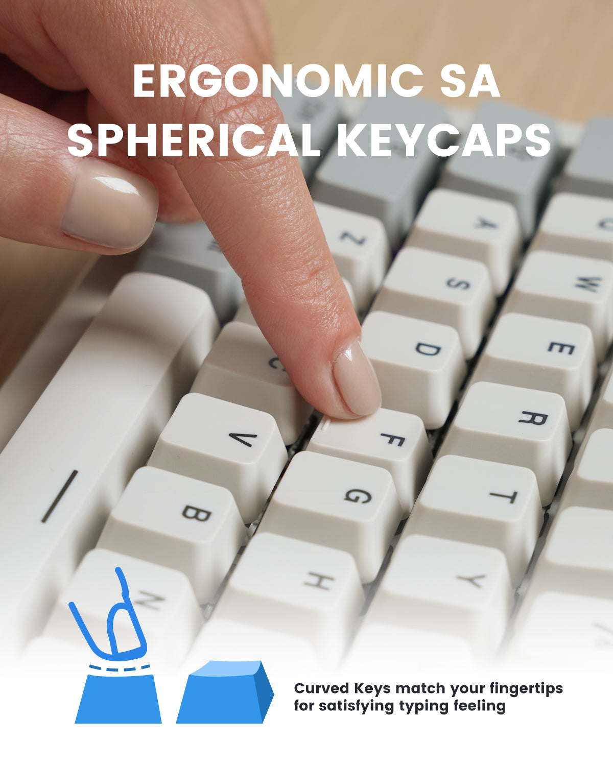 • ERGONOMIC SA SPHERICAL KEYCAPS - Curved key design with a flatter top and back edges of each key that naturally fits better with the shape of your fingertips for exceptionally comfortable typing feeling; The keys are removable and easy to clean