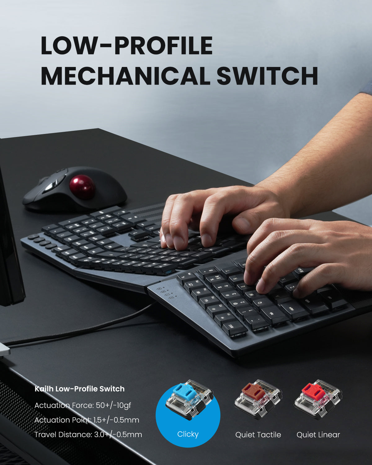 The ERGO Mechanical Keyboard employs Kailh's low-profile mechanical switches. These switches align perfectly with the keyboard's minimalist design philosophy, enabling the creation of a slim ergonomic keyboard.