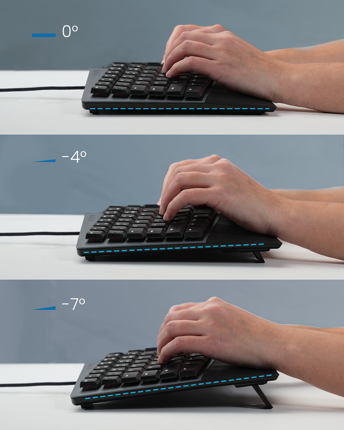 • Extra-Long 6 ft Cable & Adjustable Palm Lift: USB-A cable allows flexible desk placement and clean routing. Plug-and-play with no drivers required. Adjustable tilt legs (0°, -4°, -7°) support a natural wrist posture for seated or standing use.