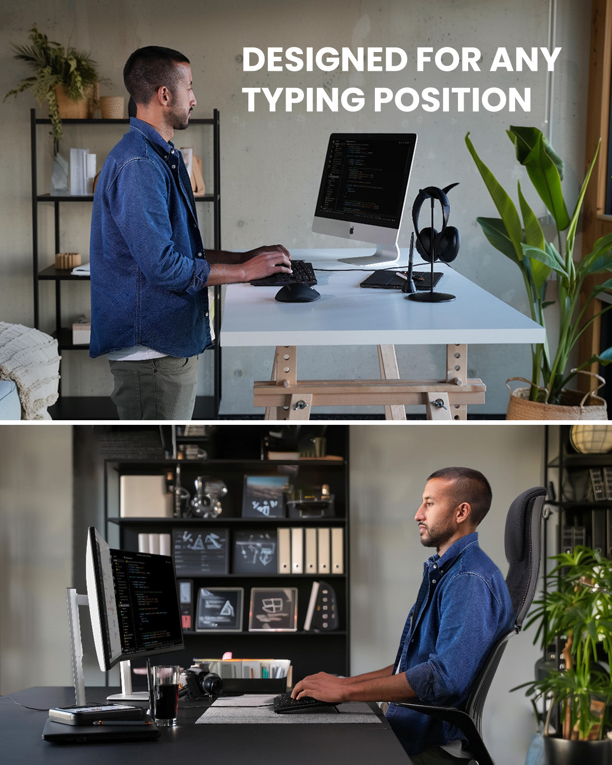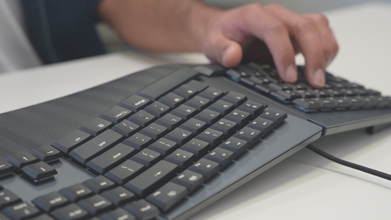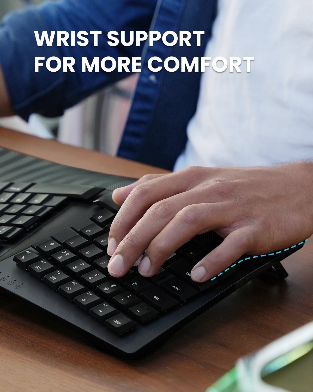 The integrated palm rest supports the palm and wrist while correcting the wrist pronation while typing to prevent unwanted pressure and muscle strains.